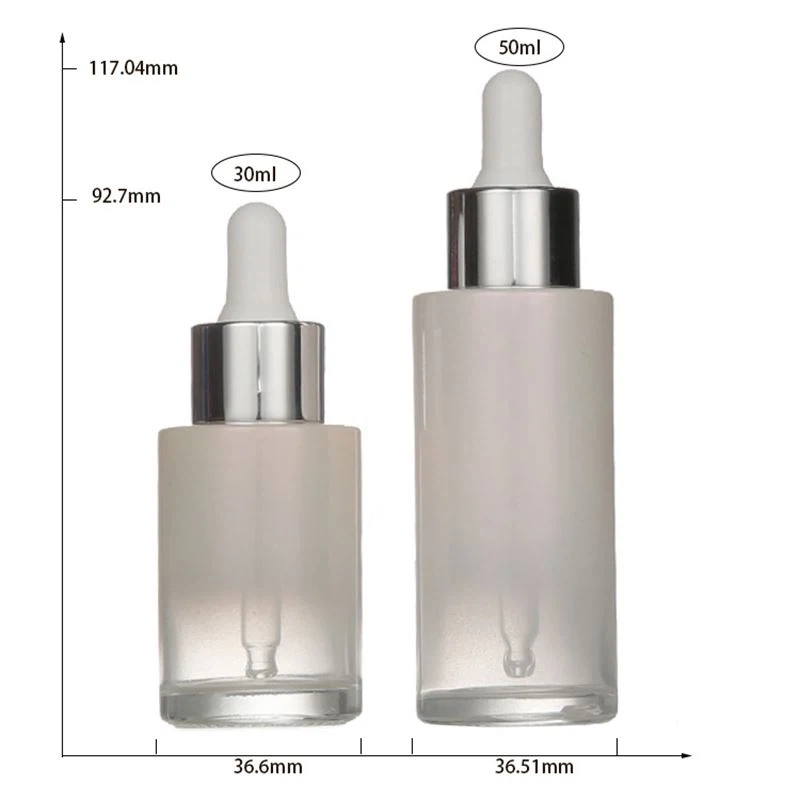 Το συγκεκριμένο μέγεθος αυτών των 10ml διαυγών φιαλών σταγονιδιού γυαλιού είναι diam. 36.51×H 117.04mm, το βάρος είναι 78g, και η καθαρή περιεκτικότητα είναι 50ml. Το μέγεθος σχεδιασμού του άλλου μικρού μπουκαλιού είναι 36,6 × H 92,7mm, το βάρος είναι 63g και η καθαρή περιεκτικότητα είναι 30ml. Το σώμα μπουκαλιών αποτελείται από τη βαθιά σκόνη ομίχλης, και ο φελλός είναι ένα χαμηλός-κλειδί ασήμι.
